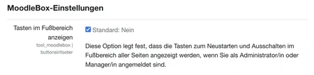 Diese Funktion wird aktiviert, indem Sie die MoodleBox-Einstellungen in der Administrationsoberfläche aufrufen: Website-Administration > Server > MoodleBox > MoodleBox settings, dann das Ankreuzfeld “Show buttons in footer” aktivieren.