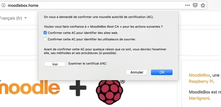 To connect to the MoodleBox via HTTPS without displaying a warning window, it is necessary to install the MoodleBox root certificate (or CA certificate). This certificate, issued by the MoodleBox project as a certification authority, allows the browser to ensure that the certificate on the MoodleBox website is valid.