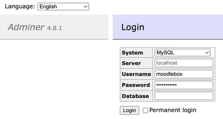 MoodleBox permite el acceso a la base de datos de Moodle con fines de administración, a través del software Adminer. Para acceder a la interfaz de inicio de sesión, escriba la siguiente URL http://moodlebox.home/adminer.php en la barra de direcciones de su navegador, y escriba las credenciales que aparecen a continuación. Por supuesto, la contraseña es diferente si la ha cambiado.