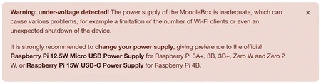 Cuando la fuente de alimentación de MoodleBox no es adecuada, se muestra un aviso en la parte superior de cada página. Este aviso sólo es visible para el administrador. Los demás usuarios de MoodleBox no lo ven.