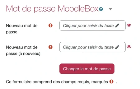 Dans la section Mot de passe MoodleBox, saisissez votre nouveau mot de passe, le même dans les deux champs. En cliquant sur l’icône d’œil, vous pouvez faire apparaître les caractères que vous avez tapés. Nous recommandons de choisir un mot de passe fort.