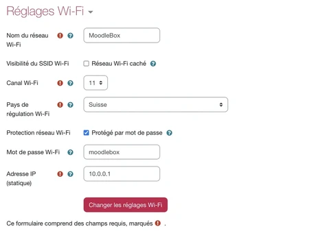 Afin d’éviter des collisions avec le réseau local existant, il est possible de changer l’adresse IP fixe du réseau WiFi de la MoodleBox, en modifiant le champ correspondant.