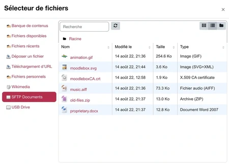 Les fichiers déposés dans la MoodleBox par SFTP, dans le dossier dénommé files, sont aussi disponibles les administrateurs et les enseignants définis dans Moodle, au moyen du sélecteur de fichiers, via un dépôt dont le nom est SFTP Documents.