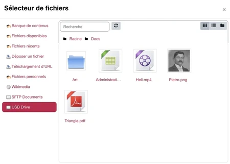 Quand une clef USB est insérée dans l’un des ports USB de la MoodleBox, tous les fichiers sur la clef sont automatiquement disponibles pour les administrateurs et les enseignants définis dans Moodle, au moyen du sélecteur de fichiers, via un dépôt dont le nom est USB Drive.